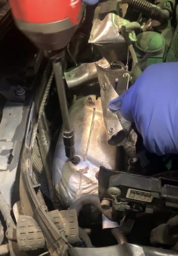 5) On the upper DPF heat shield, remove the 3 nuts (10mm) and remove