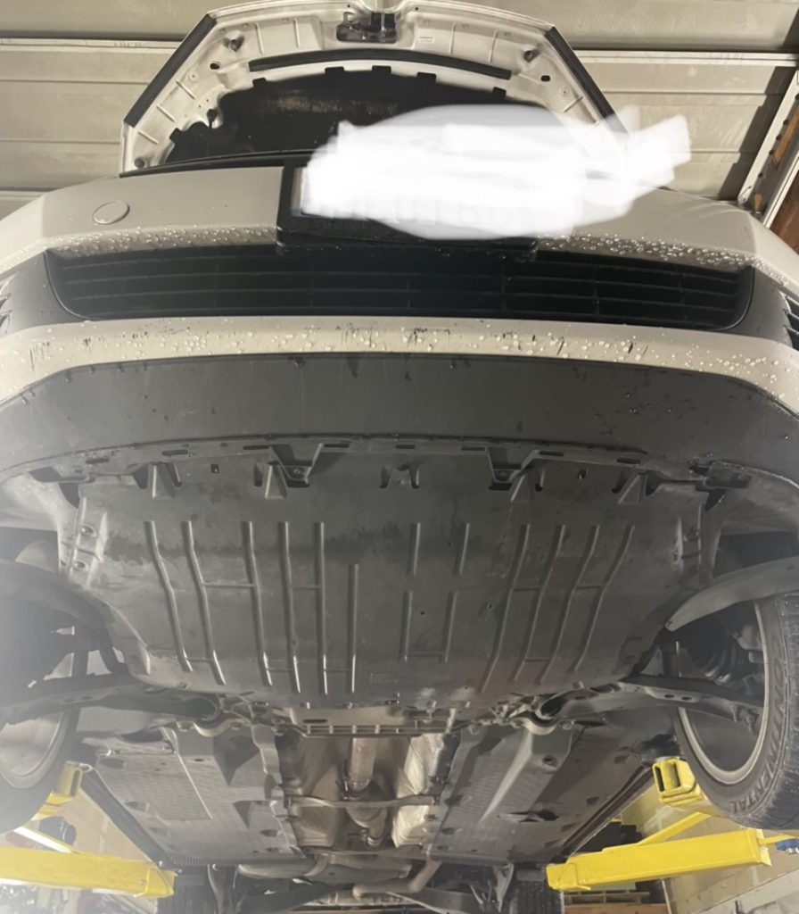 (c) Unscrew 4 plastic nuts holding the plastic undercarriage protector to the body.